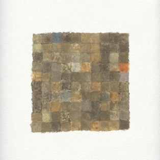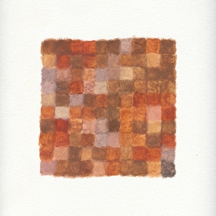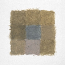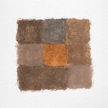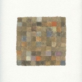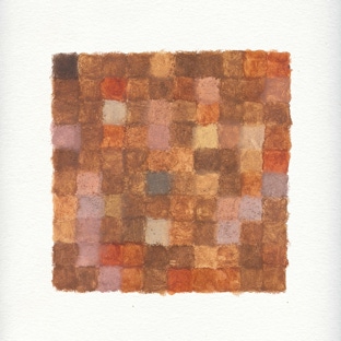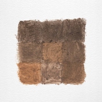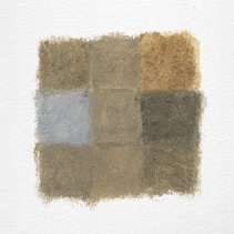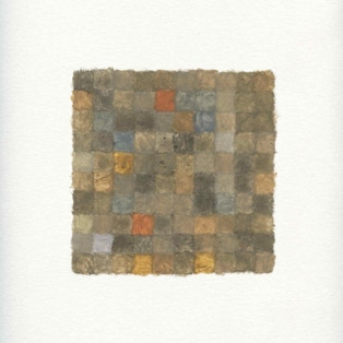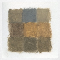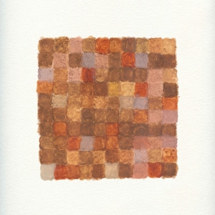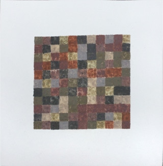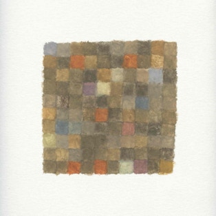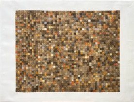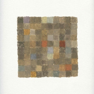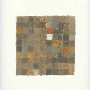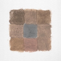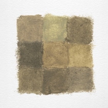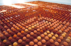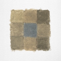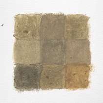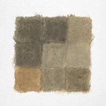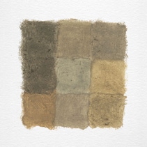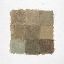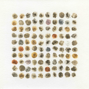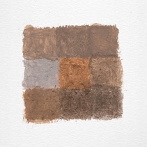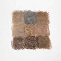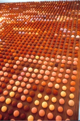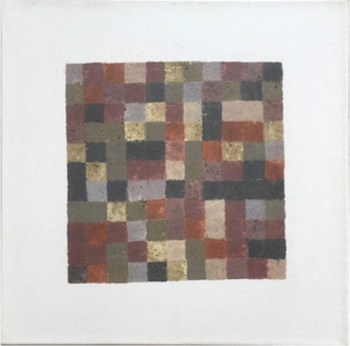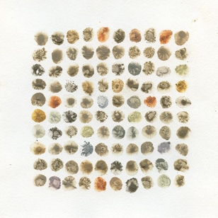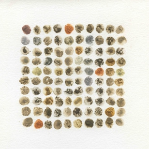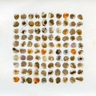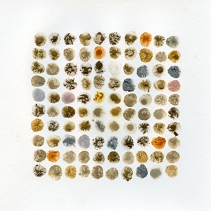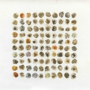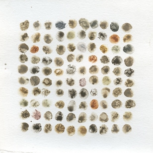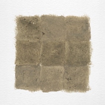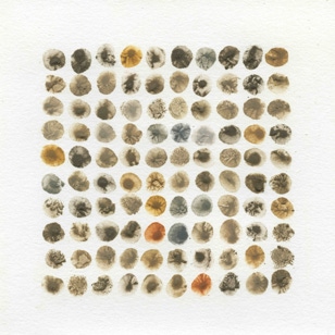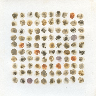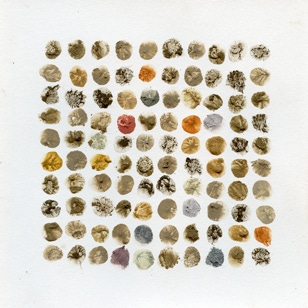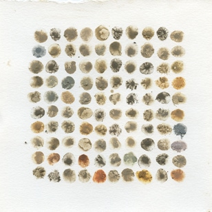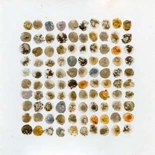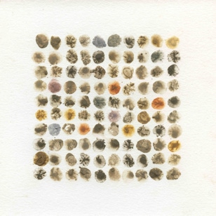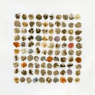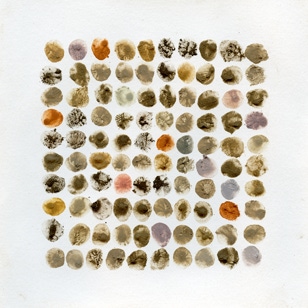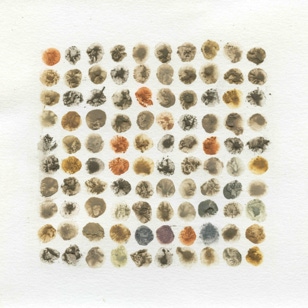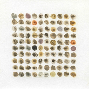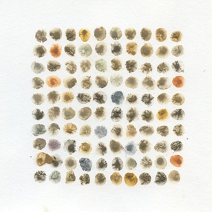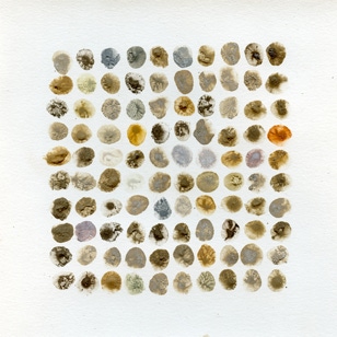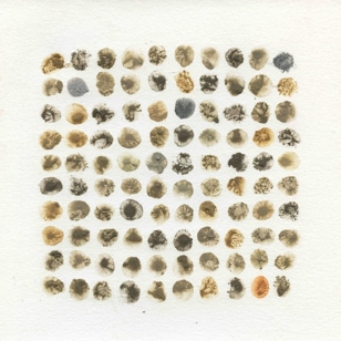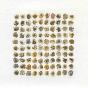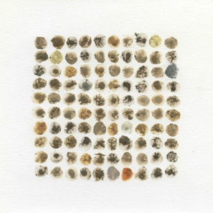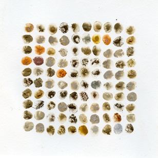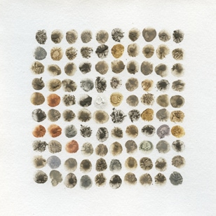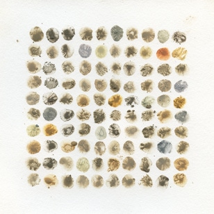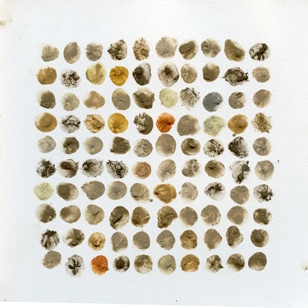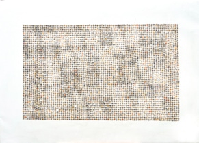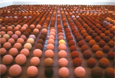 That text continues: “In the works of recent years, the same hands have smeared mud to map the movements of the artist’s windmilling arms on a surface. The areas thus described are then filled in by the repetitive accretion of lines made with parallel, echoing movements of a brush. These works, on canvas, on paper, or on the wall, take the simplest materials in their rawest form and harness the body’s natural geometry to create images which refer to nothing more than bodily rhythms and the daily round. They are as light in their effect as they are pure in their means, thanks to the spaces in between the lines, whose dimensions are determined by theuncontrived measurement of the eye, hand and fingers as they do their work. The mud balls represent an even simpler use of raw materials, mud as mud, and their form is a similarly straightforward expression of the hands that make them. In their spacing for the installation the same natural measurement is at work, resulting again in a lightness in the background grid which records the rhythm of production and deployment.”
