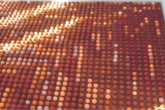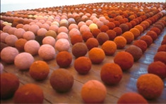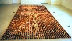 Now the artist is far away and the issues seem more complicated. The simple act has been carried out here and there, and the locations for it are linked by the fact as surely as those which were the sources of the materials used. The earth is scooped up, possessed, a claim staked. The number of spheres grows, and the slow evaporation of moisture from the mud becomes somehow analogous to the cooling of the core beneath the mantle. This sphere is comfortingly small, one amongst many. While my friend has bought land out there, settled on it, his conical territory still meets mine at the centre, and above we tread the same crust.