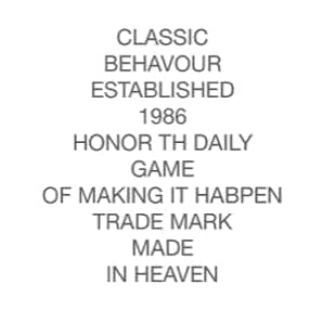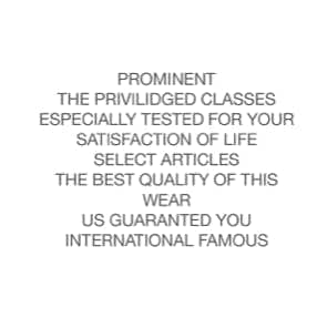 And are we right to read the supposedly anglophone misapprehensions of Global English garment literature as errors in the first place? The practices of Global English garment literature are like those of any “natural language” community. The people in this community – which intersects and overlaps with our own – have things to say, stories to tell, and they also have the media they need for their communications. Disregarding spelling and grammar, it’s difficult to find an expressive moment in this selection by Nick Rands when the reader is any doubt about what is felt or meant. The characteristics of garment media do somewhat constrain the range of topics that are, typically, addressed, but this true for any writing. An author can write anything in principle, but for the sake of being appreciated they are wise to “GO STRAIGHT TO THE POINT / ALWAYS.” This is, after all, literature intended to be worn as it is read, literary “STYLE FOR LIVE.” Is “live” an error here or is it not simply a part of the poetry, expressing indeed the ars poetica of a living literature, one of the literatures that actually live? It is a literature that allows me to have deep “SYMPONY / WITH / LOVE PEOPLE,” indeed, a symphony of sympathy with people who live well and love what they wear. It makes me want to pony up and learn this language “properly.” But if I did, my learning, like those of the grammarians, would come after its events of language. It wouldn’t be as genuinely poetic, not really playing or “HONOR [ing] TH[e] DAILY / GAME / OF MAKING IT HABPEN,” not so worthy of “TRADE MARK / MADE / IN HEAVEN.”